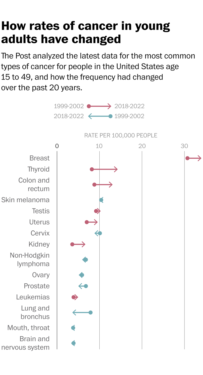 Cancer rates among people aged 15 to 49 have increased 10% since 2000 even as rates have fallen among older populations. Young women face an 83% higher cancer rate than men in the same age range. A 150,000-person study presented at the American Association for Cancer Research meeting found millennials appear to be aging biologically faster than previous generations based on blood biomarkers. That acceleration was associated with up to 42% increased risk for certain cancers including lung, gastrointestinal and uterine malignancies.